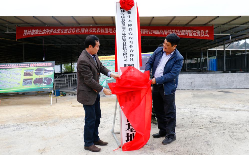雅长林场场长陈青来(右)及黄冕林场场长梁洪星(左)为黑猪养殖基地揭牌
